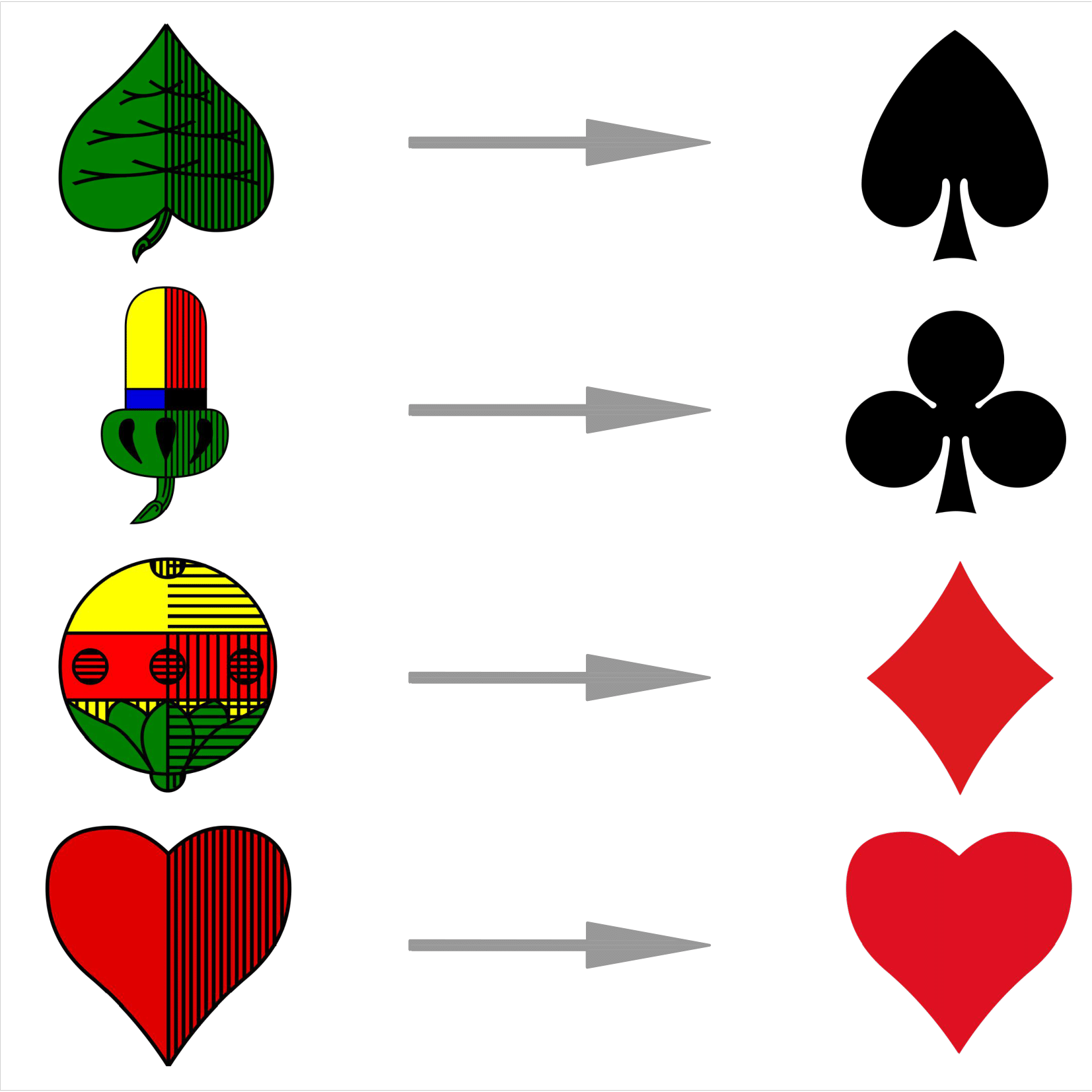- Entwicklung der Symbole vom deutschen zum französischen Spielkartensystem. Zeichnung von Karolina Juszczyk unter Verwendung von Bildern von Infanf: Laub, Eichel, Schelle und Herz, verfügbar über Wikimedia Commons (lizenzfrei).