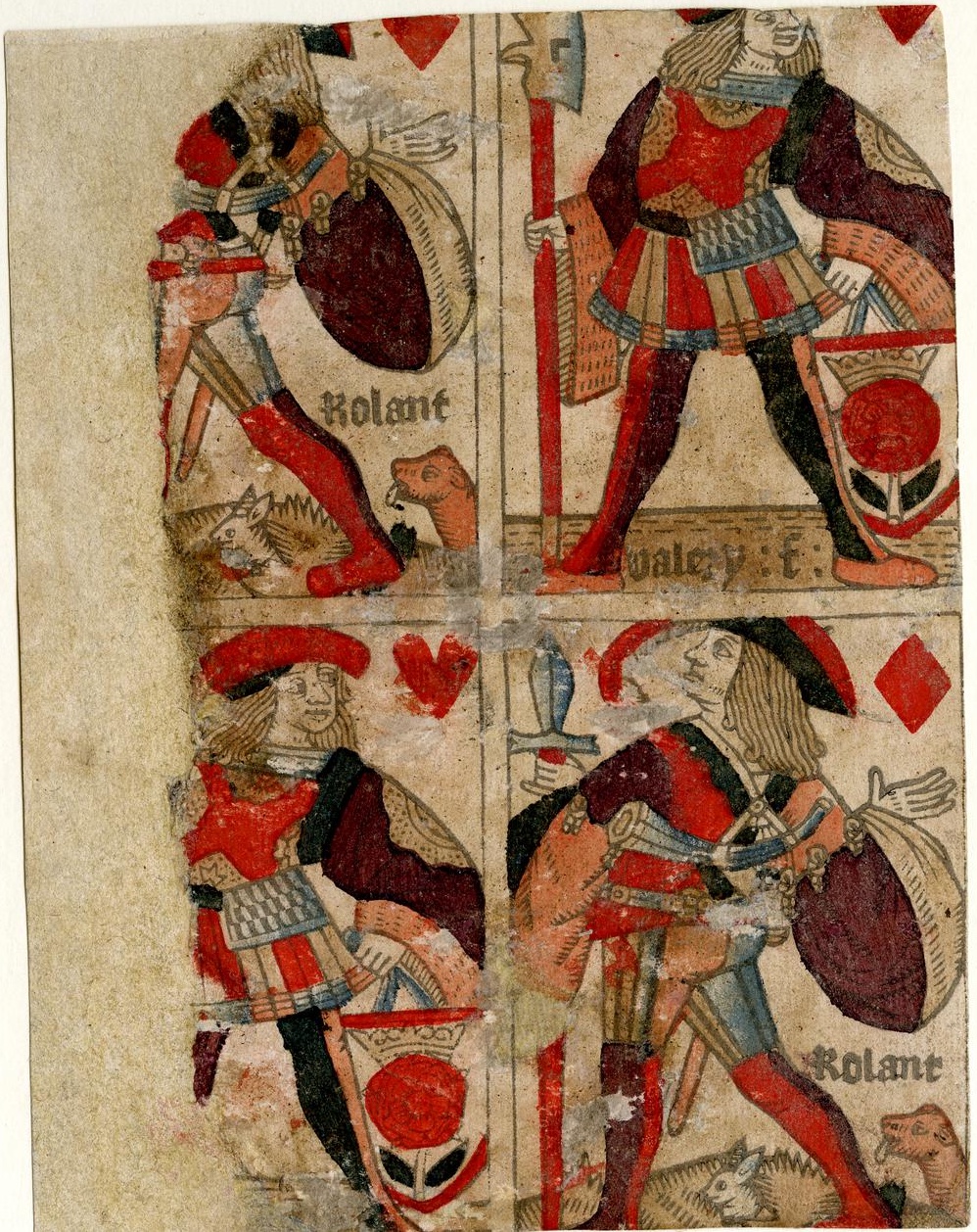 - Ein ungeschnittener Bogen französischer Spielkarten, gedruckt in Rouen von Valery Faucil um 1516; derzeit im Britischen Museum. Creative Commons Attribution-NonCommercial-ShareAlike 4.0 International (CC BY-NC-SA 4.0) Lizenz. © The Trustees of the British Museum.