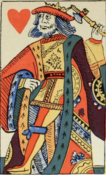 - Herz-König aus einem Kartendeck mit französischen Farbensymbolen, produziert in Rouen um 1567. Benham 1931, S. 28, Abb. 59.