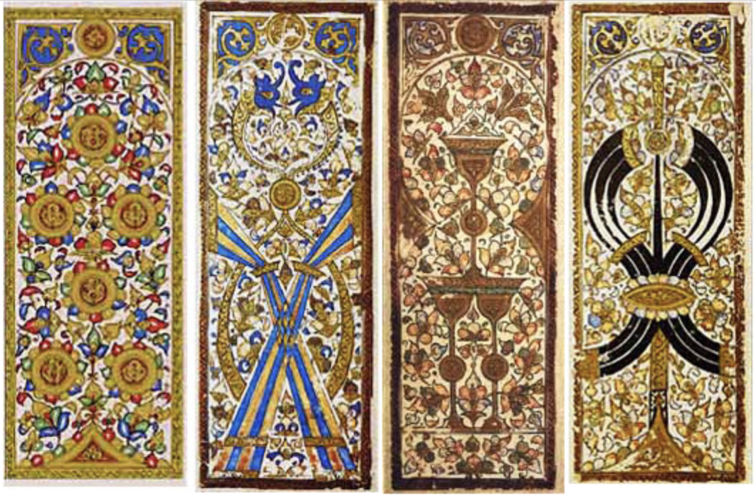 2)Topkapı-Stil-Kartendecks müssen von den Arabern bereits im 14. Jahrhundert produziert worden sein, auch wenn wir keine materiellen Beweise für Hofkarten aus dem 14. Jahrhundert haben.