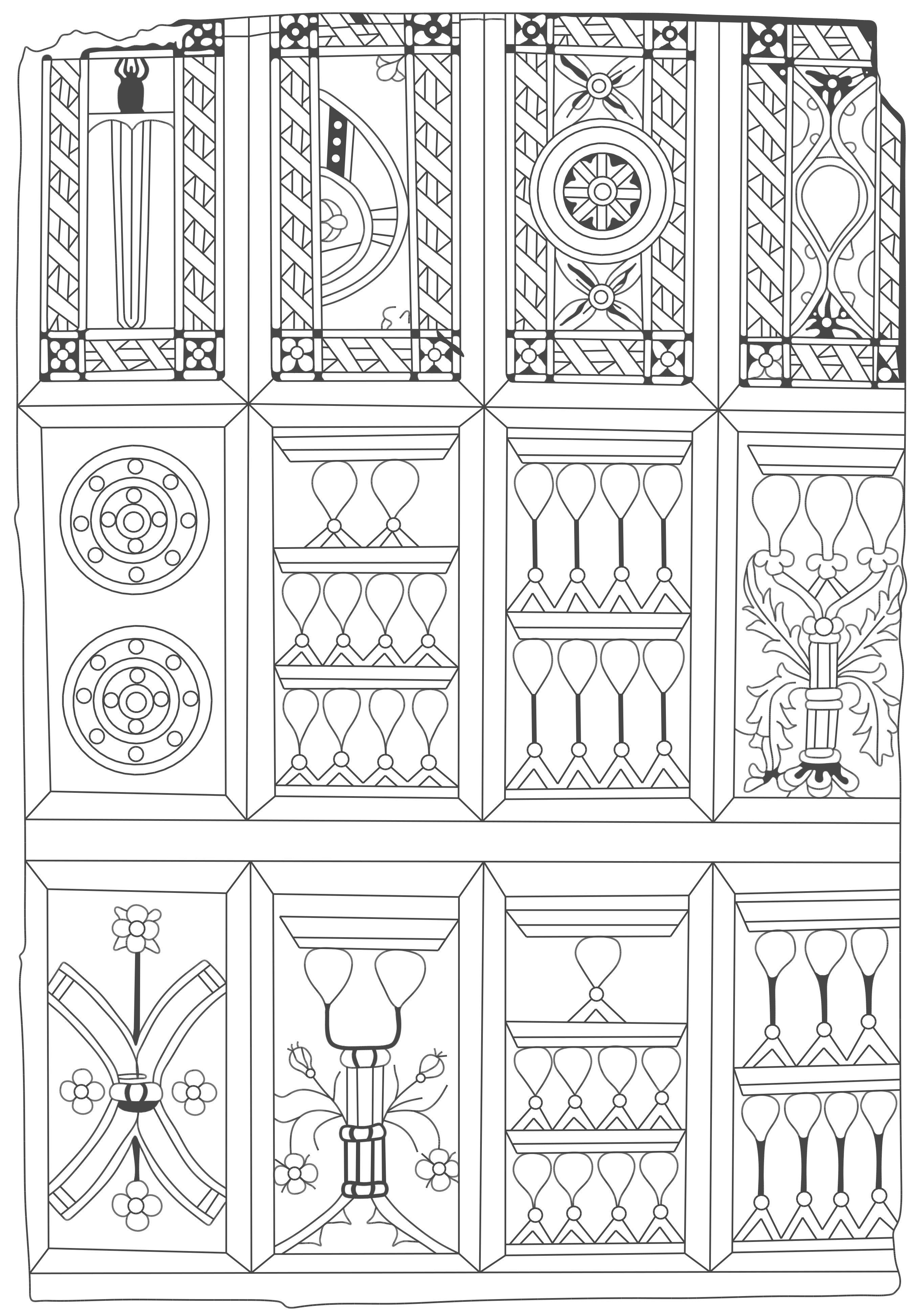 - Die ältesten europäischen Karten aus Katalonien, frühes 15. Jahrhundert. Ein ungeschnittener, schwarz-weißer Bogen mit arabischem Design; derzeit im Institut Municipal d‘Història in Barcelona. Gezeichnet von Karolina Juszczyk nach der Illustration in Simon Wintles „Moorish playing cards“.